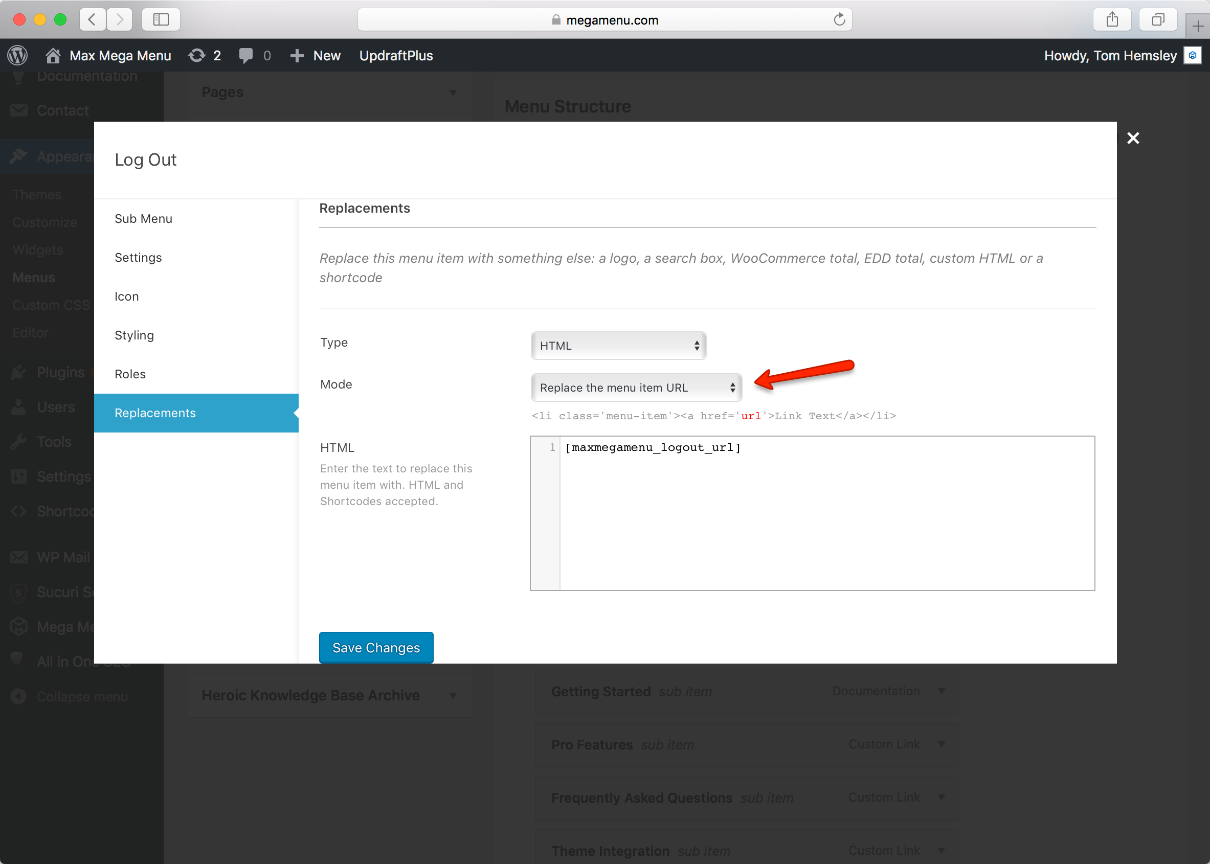 Once you’ve added the item to the menu, save the menu, then hover over the “Logout” item and click the blue Mega Menu button. Click the “Replacements” tab.