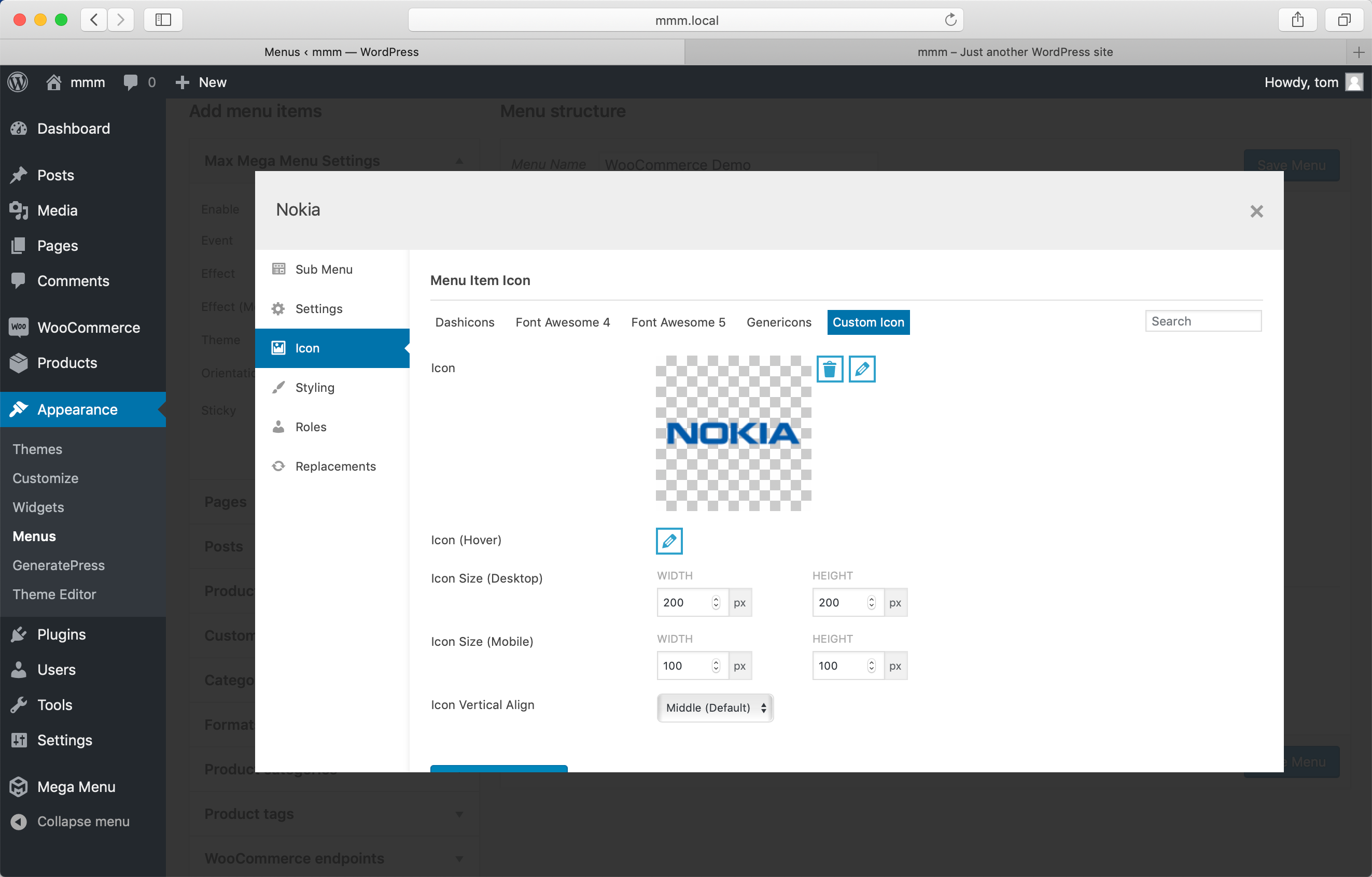 In this step we’ll be adding custom icons to our WooCommerce menu items. This functionality is part of Max Mega Menu Pro. Users of the free plugin can choose dashicons instead.