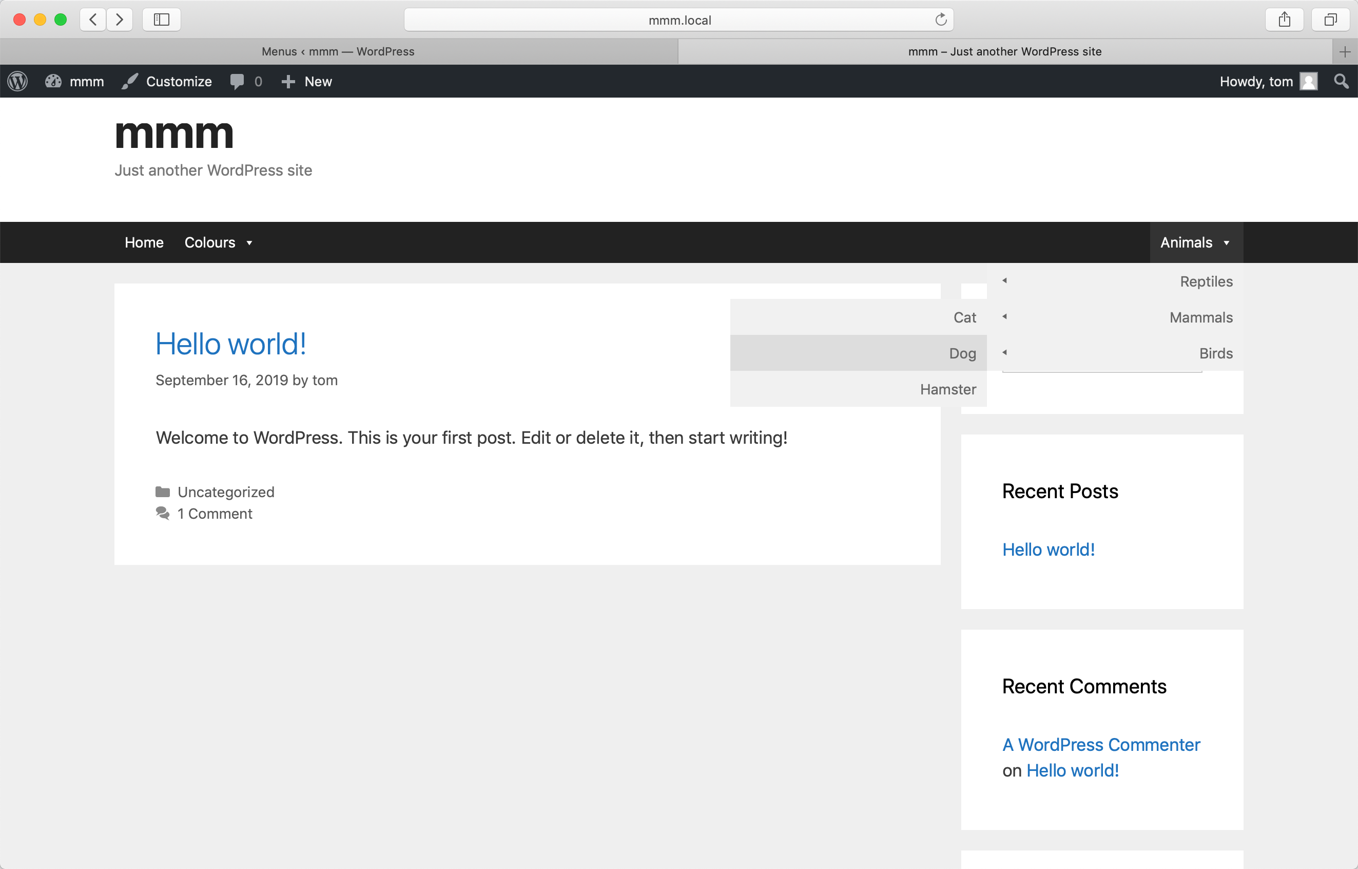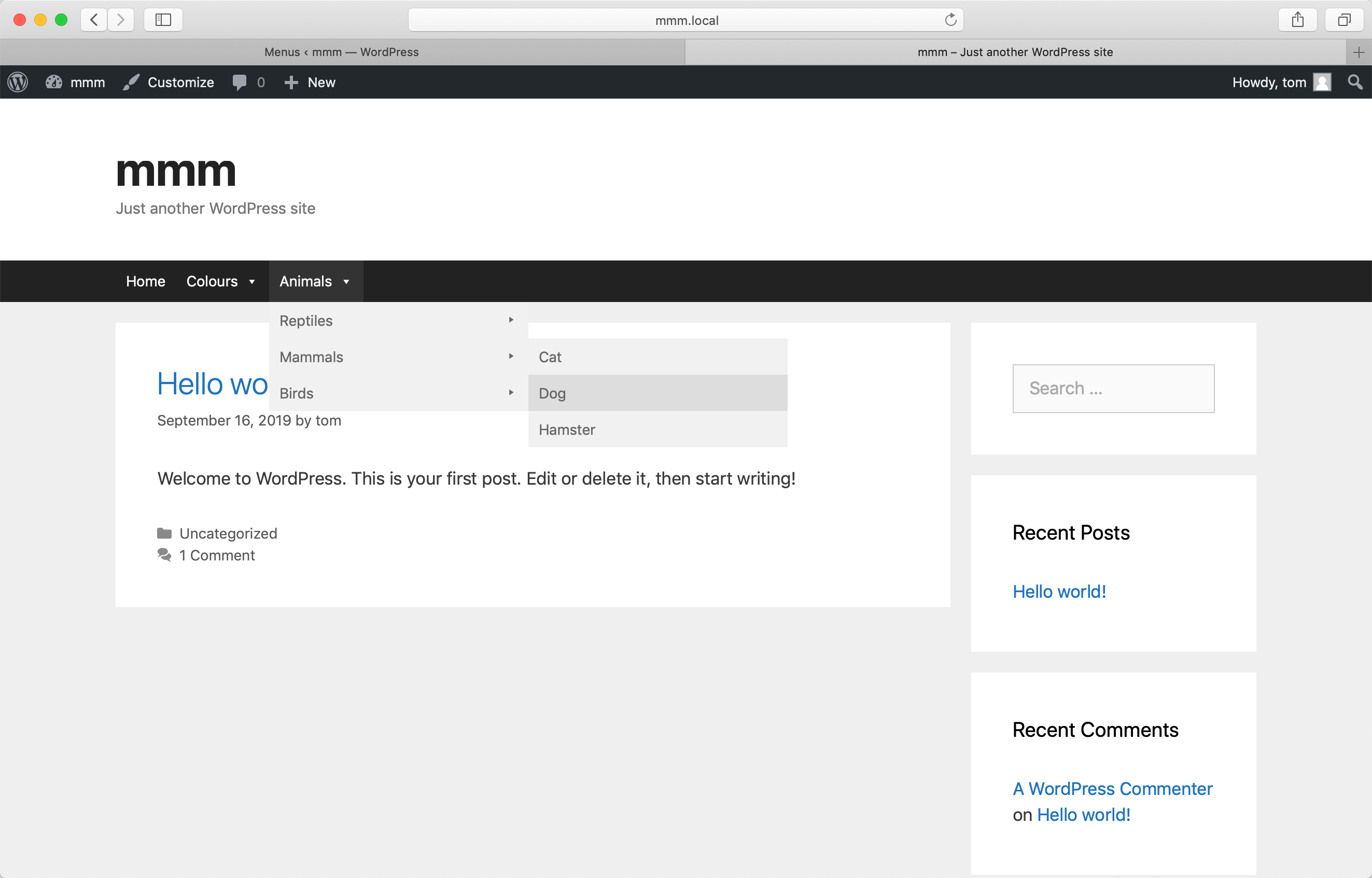 The following is a screenshot demonstrating the following settings on the “Animals” menu item: