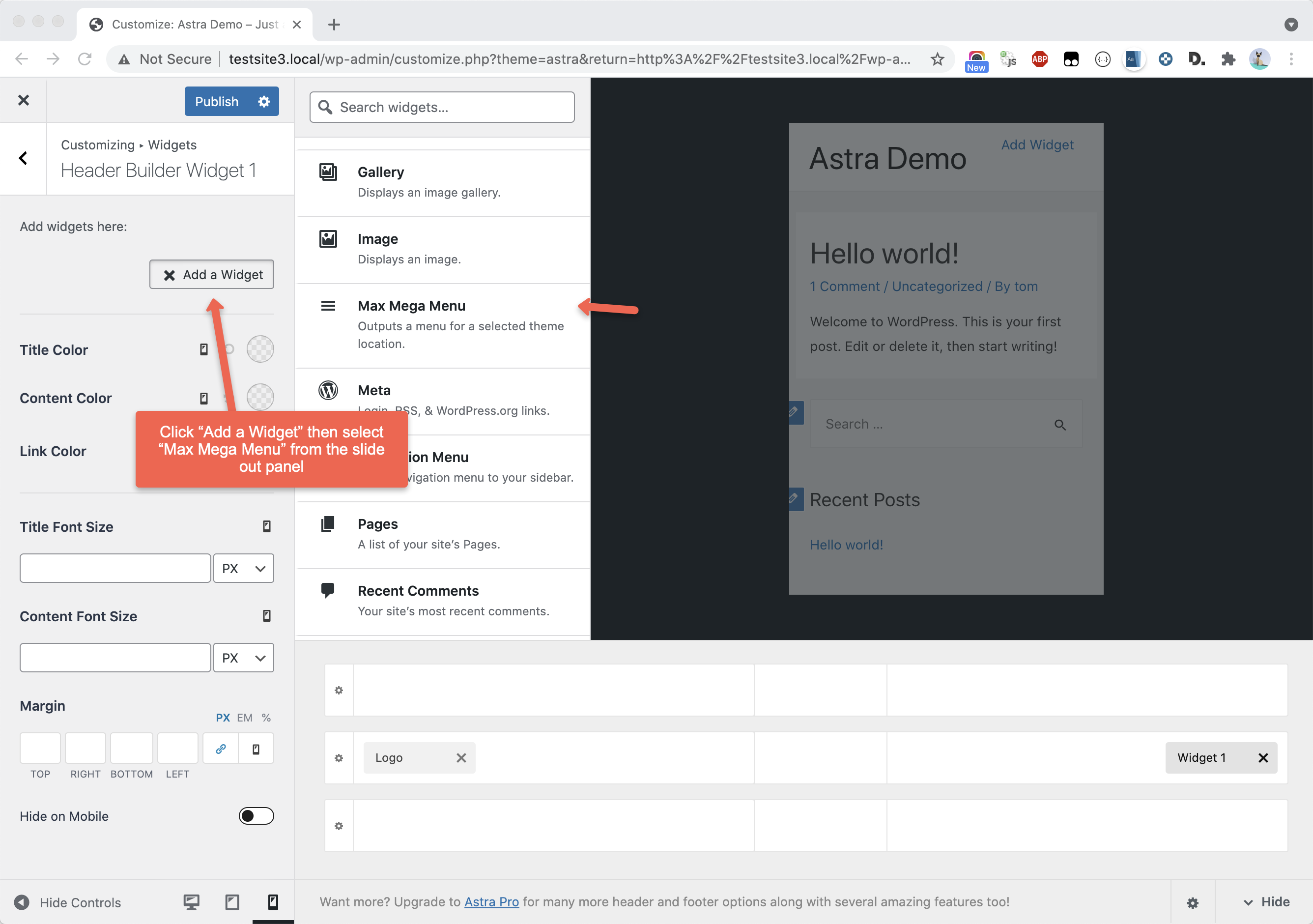 Add the “Max Mega Menu” widget to the widget area:
