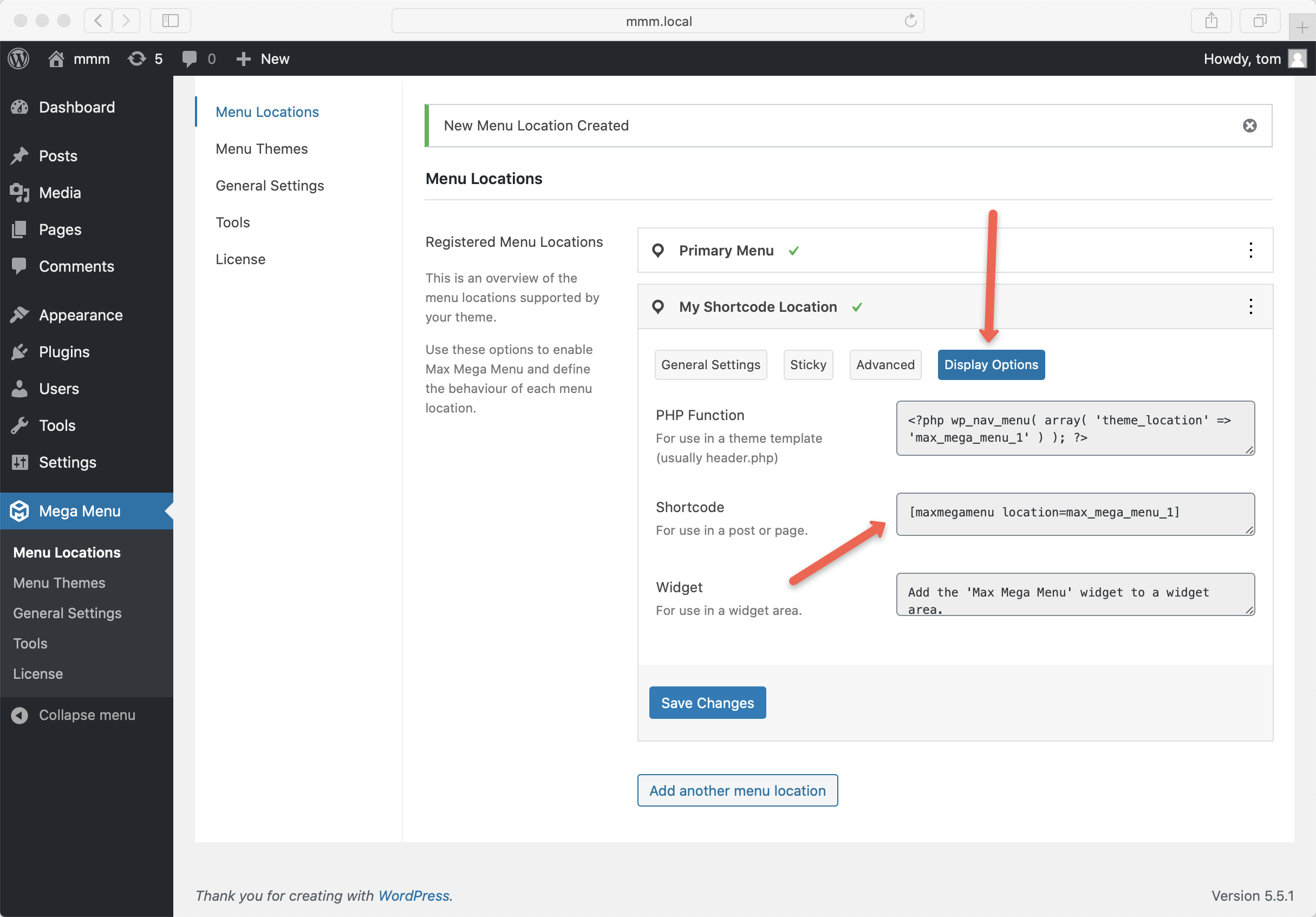 After creating the location you’ll be taken back to the main Menu Locations page. Expand the new location and go to the Display Options tab. You’ll find the shortcode here.