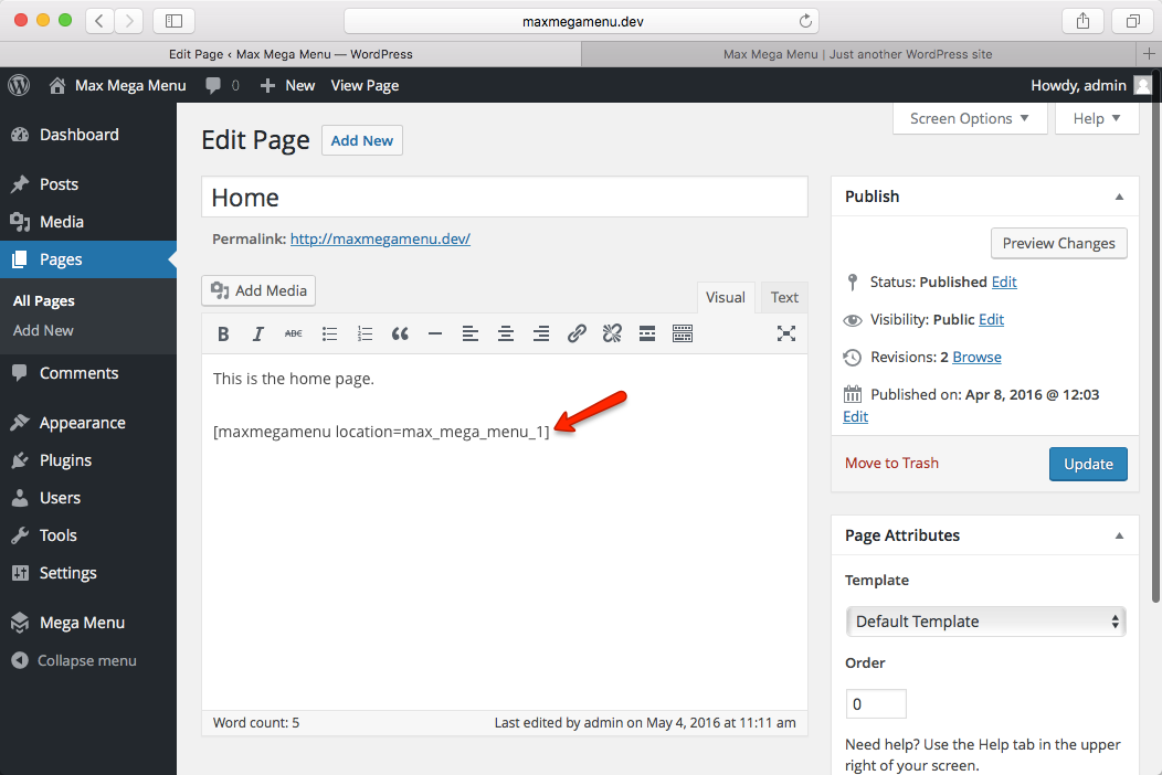 We now have a shortcode that can be pasted into posts and pages to display our new menu location.