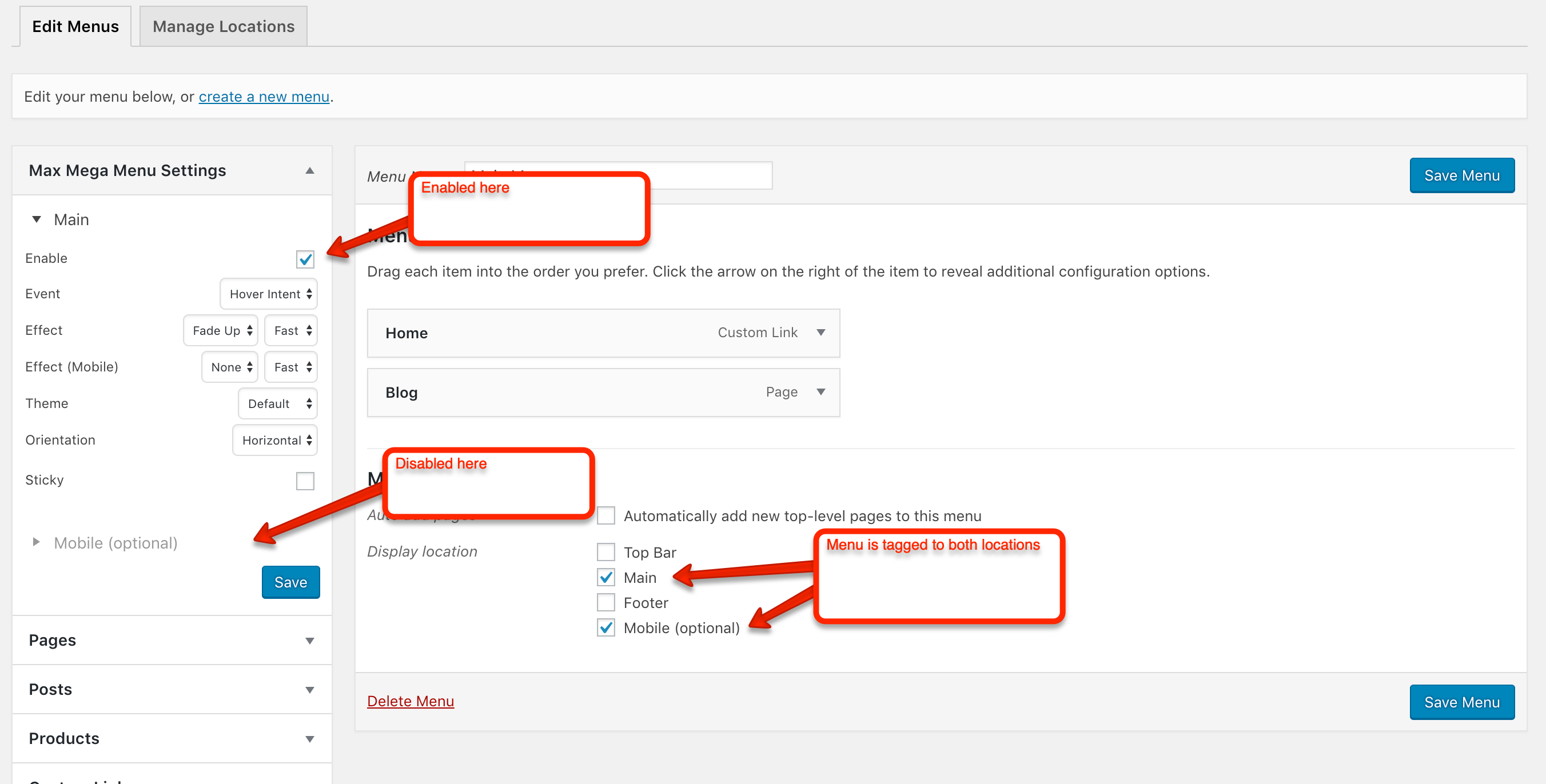 To display the standard theme mobile menu in the slide out panel, tag your main menu to the “Mobile (optional)” location, but do not enable Max Mega Menu for it:
