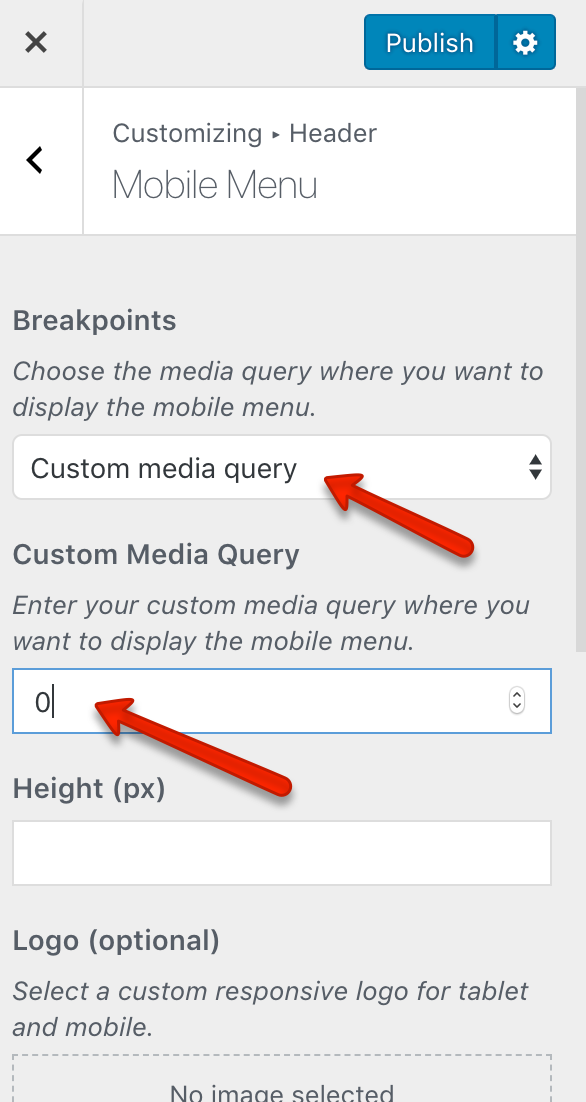 To use the Max Mega Menu mobile menu, go to Appearance > Customize > Header > Mobile Menu and apply the following settings: