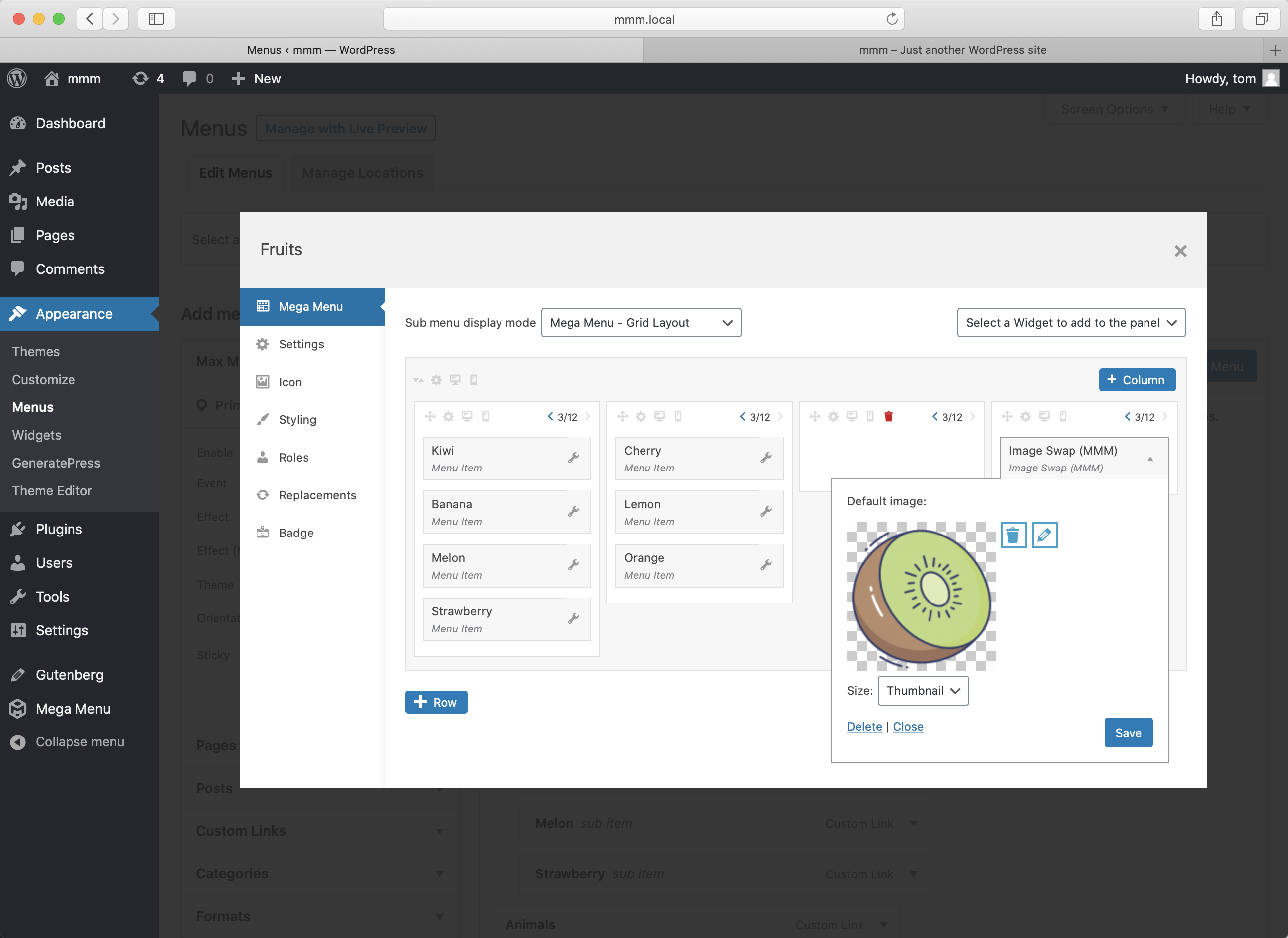 Hovering over the “Fruits” menu item and clicking the blue “Mega Menu” button launches the Mega Menu builder. We’ve arranged the sub menu items (Kiwi, Orange etc) into 2 columns, and added a blank column (for spacing) and a “Image Swap (MMM)” widget into the right most column. We’ve selected a Kiwi image to use as the default image.