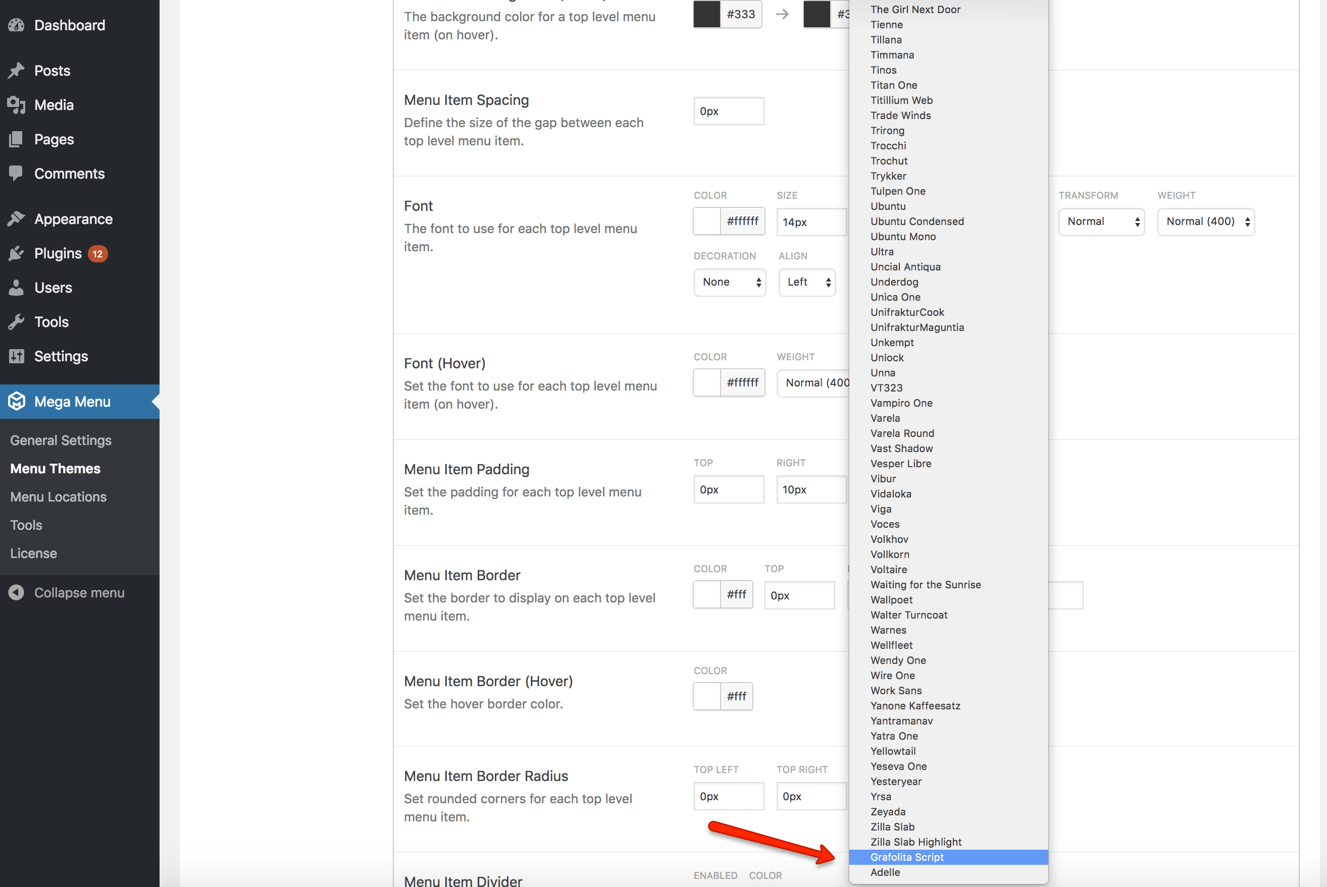 Once you have entered the custom fonts you’d like to use, go to the Theme Editor (Mega Menu > Menu Themes) and edit your menu theme. You will see your custom fonts listed at the bottom of each font selector.