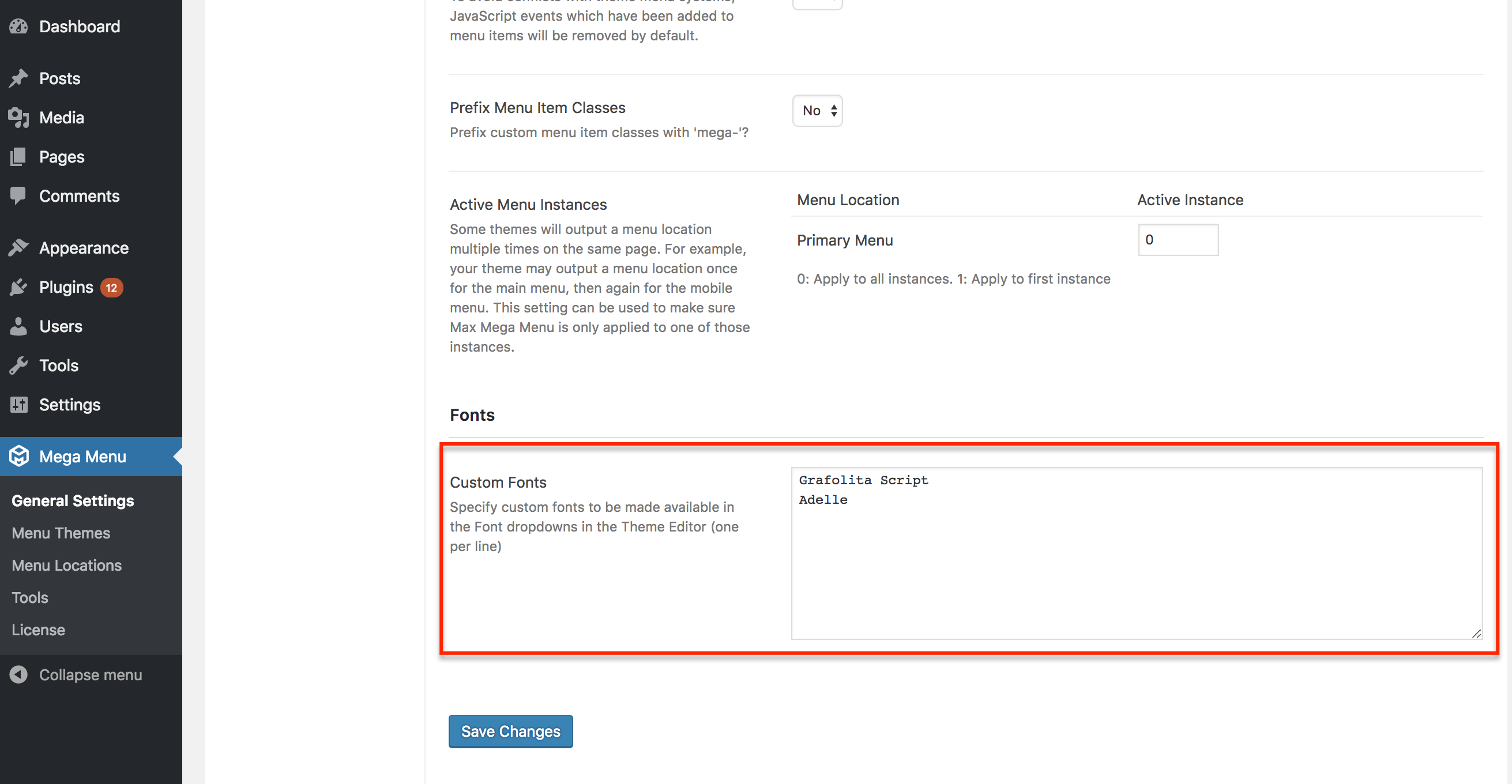 To add a custom font to the Theme Editor, go to Mega Menu > General Settings. Scroll down to Custom Fonts and enter the name of each custom font onto a new line: