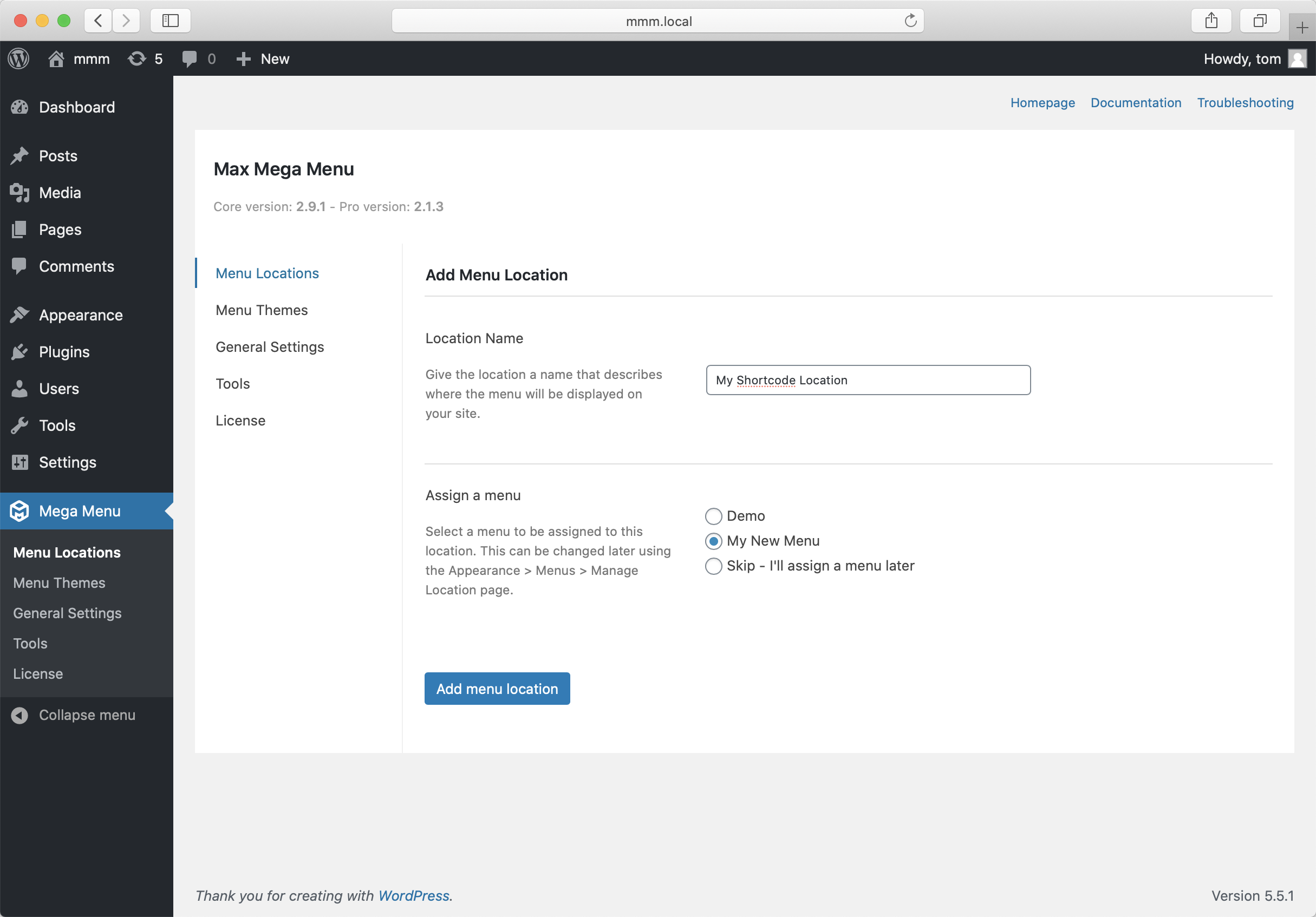 On the next page, provide a name for the new location and click ‘Add menu location’.