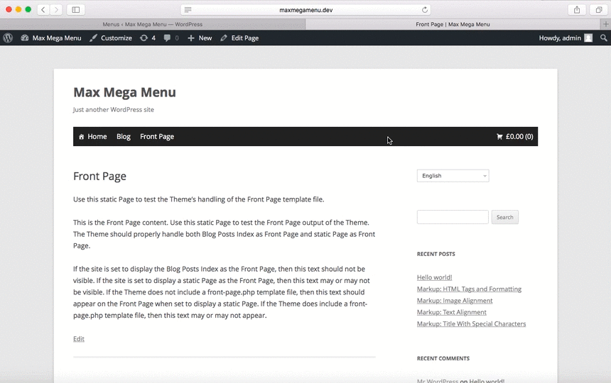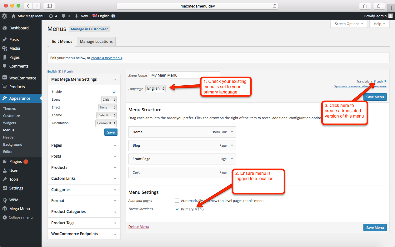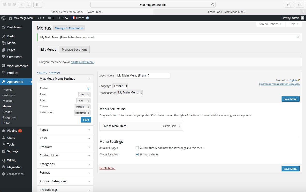 In this step we assume you’ve already set up a menu for your primary language (English) and enabled Max Mega Menu for it.