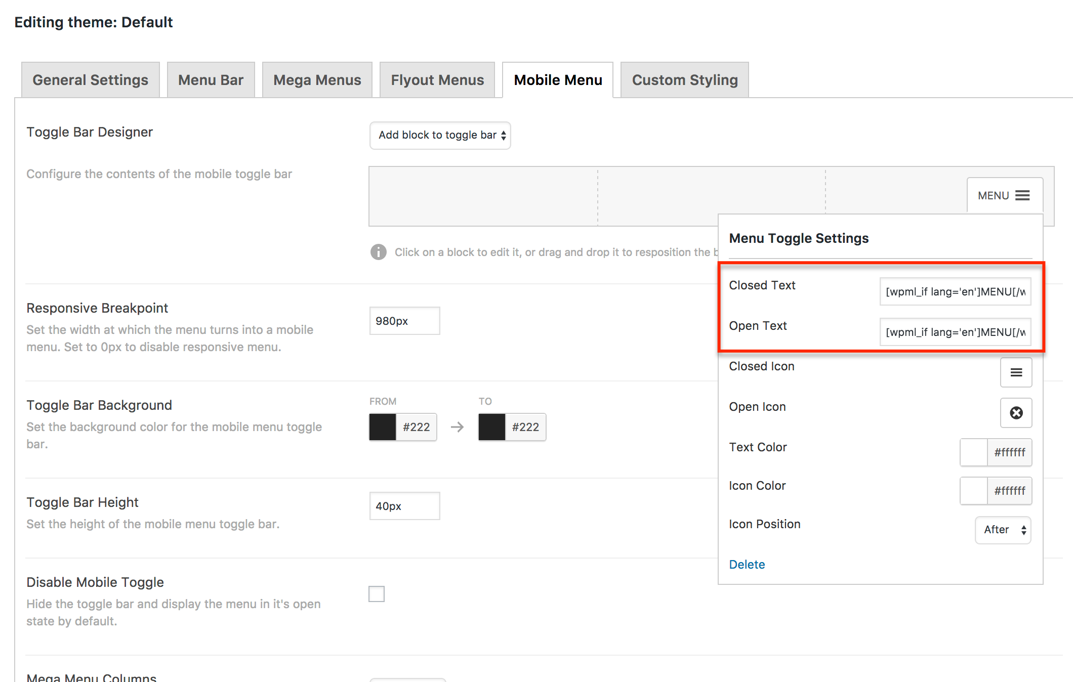 Step 2: Go to Mega Menu > Menu Themes. In the mobile section, edit the mobile toggle block settings and use the following shortcode to display different text depending on the current language.