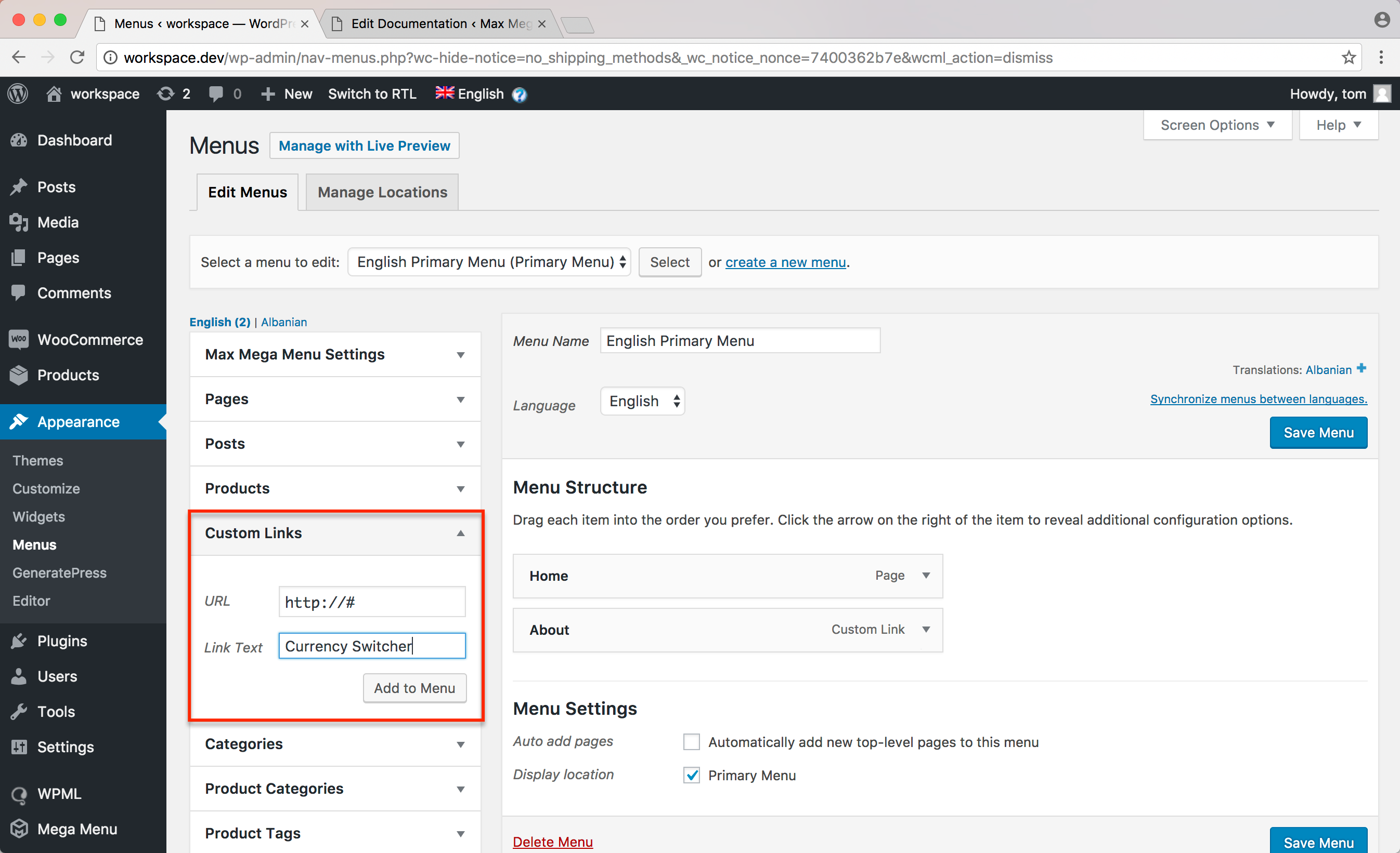 Set the title of the Custom Link to “Currency Switcher” and the URL to “http://#”.