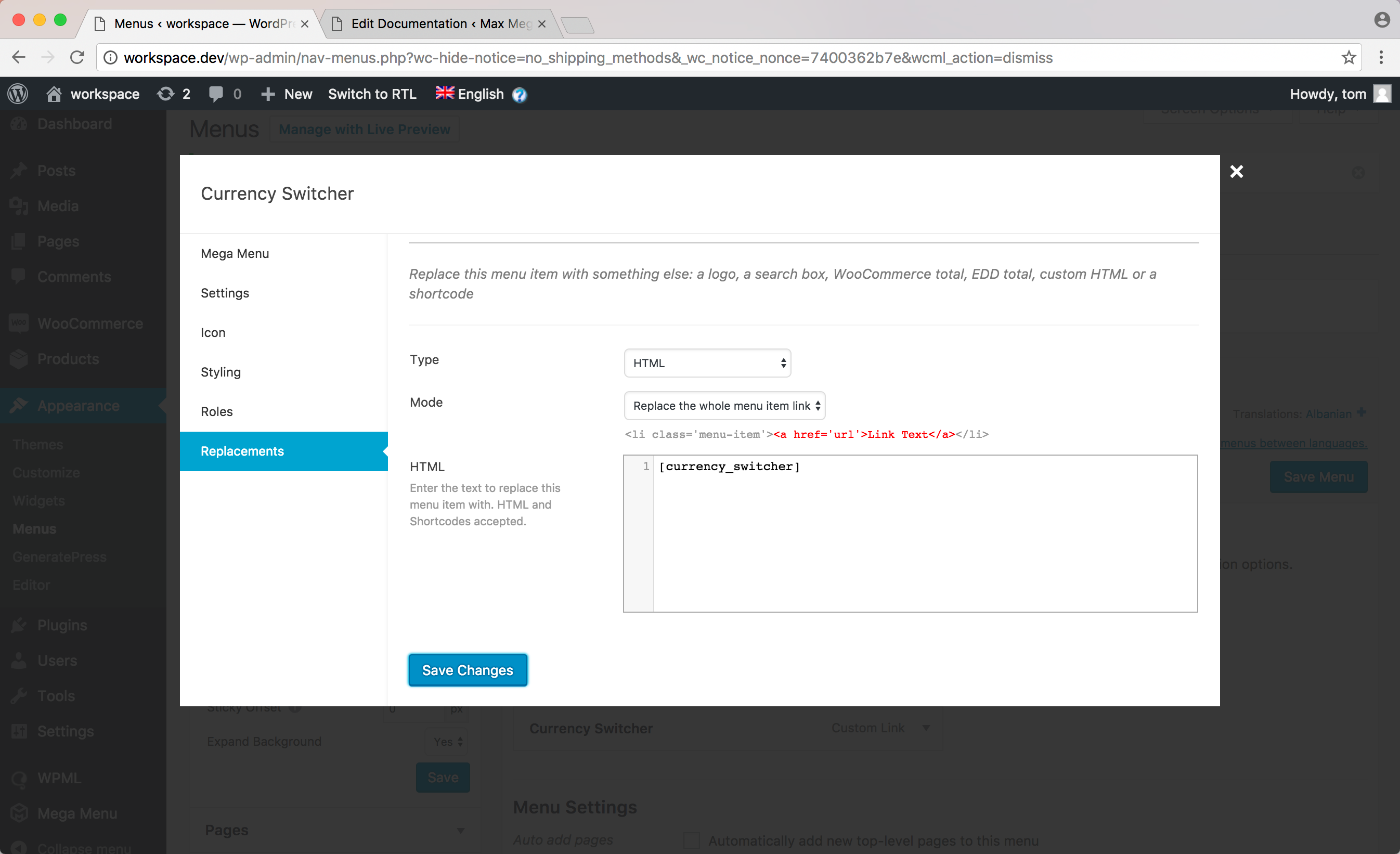 Save the menu, then hover over the “Currency Switcher” item and click the blue Mega Menu button.