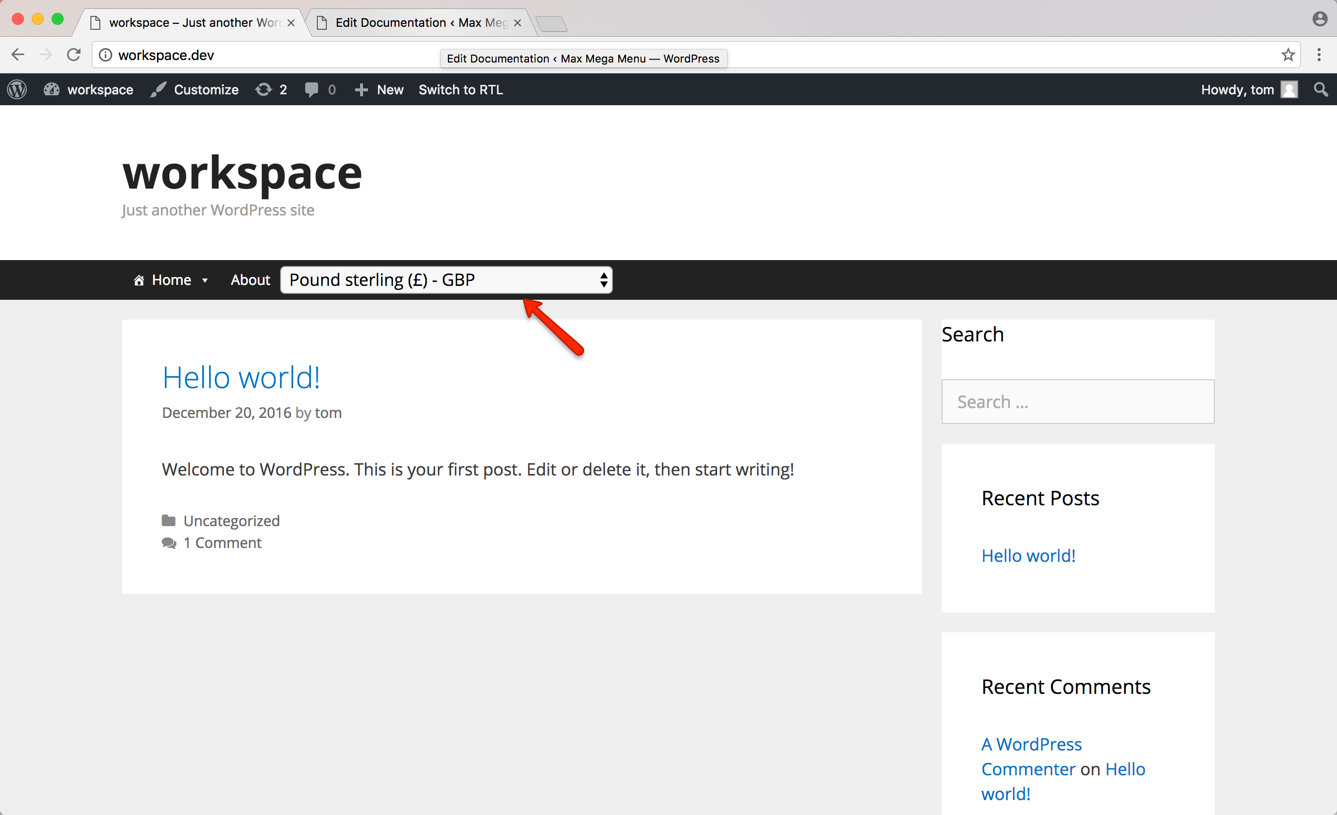 In this example we will demonstrate how to display a shortcode alongside existing top level menu items.