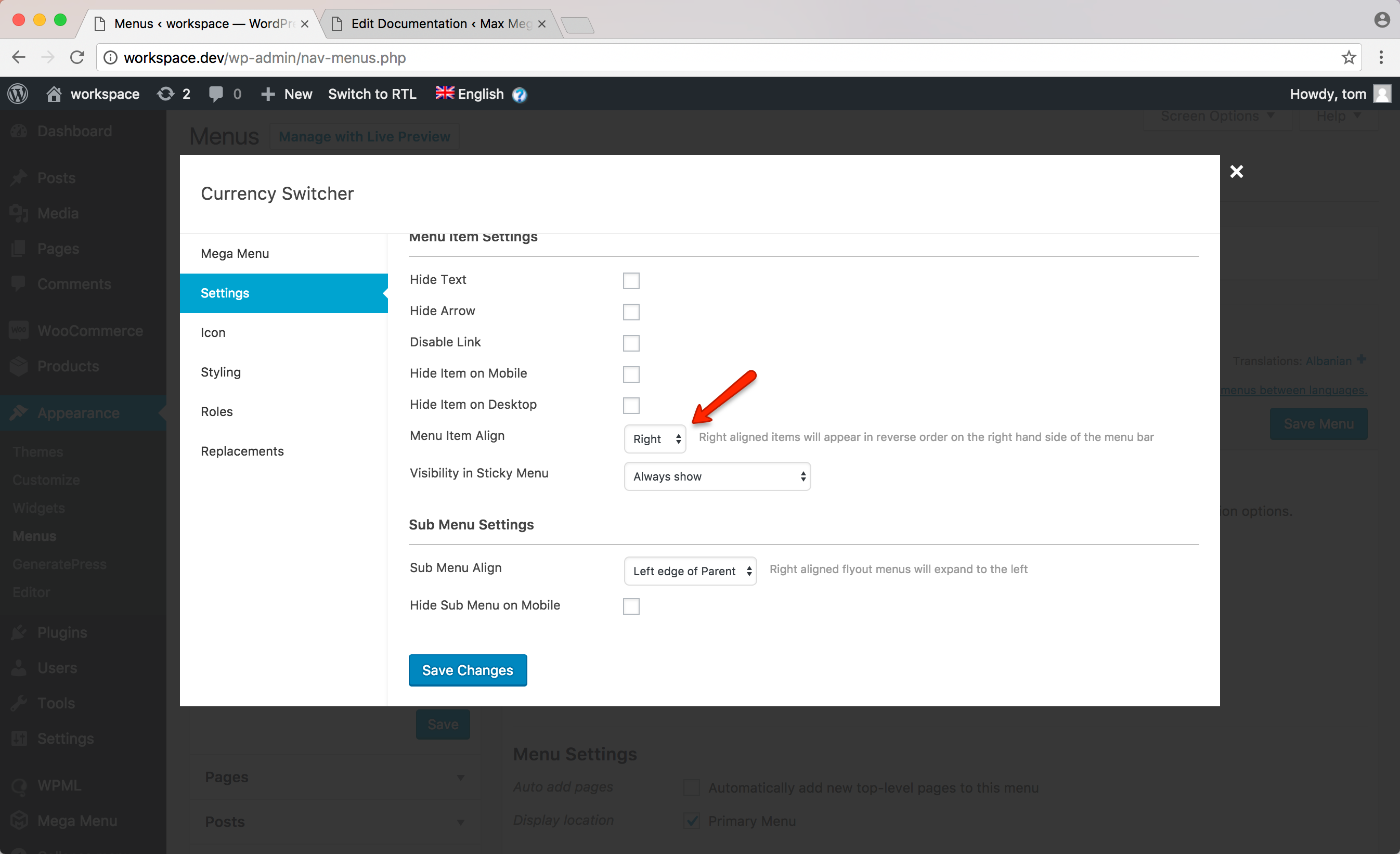 We can continue to use the mega menu settings for the item, including aligning the item to the right hand side of the menu: