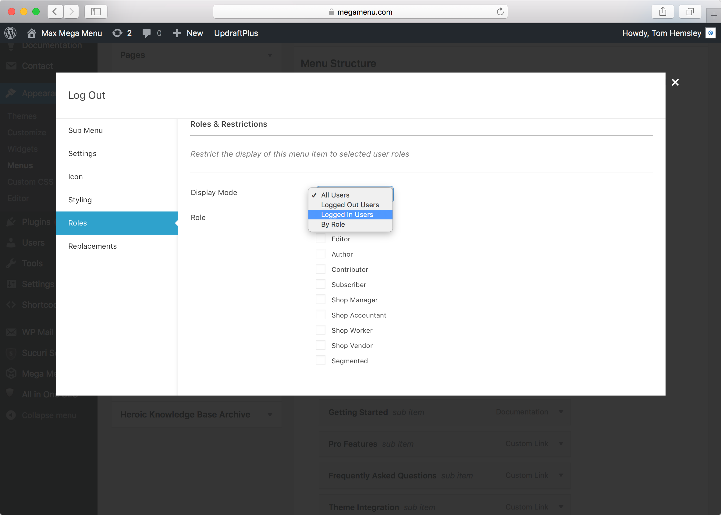 Once you’ve added the item to the menu, save the menu, then hover over the “Logout” item and click the blue Mega Menu button. Click the “Replacements” tab.