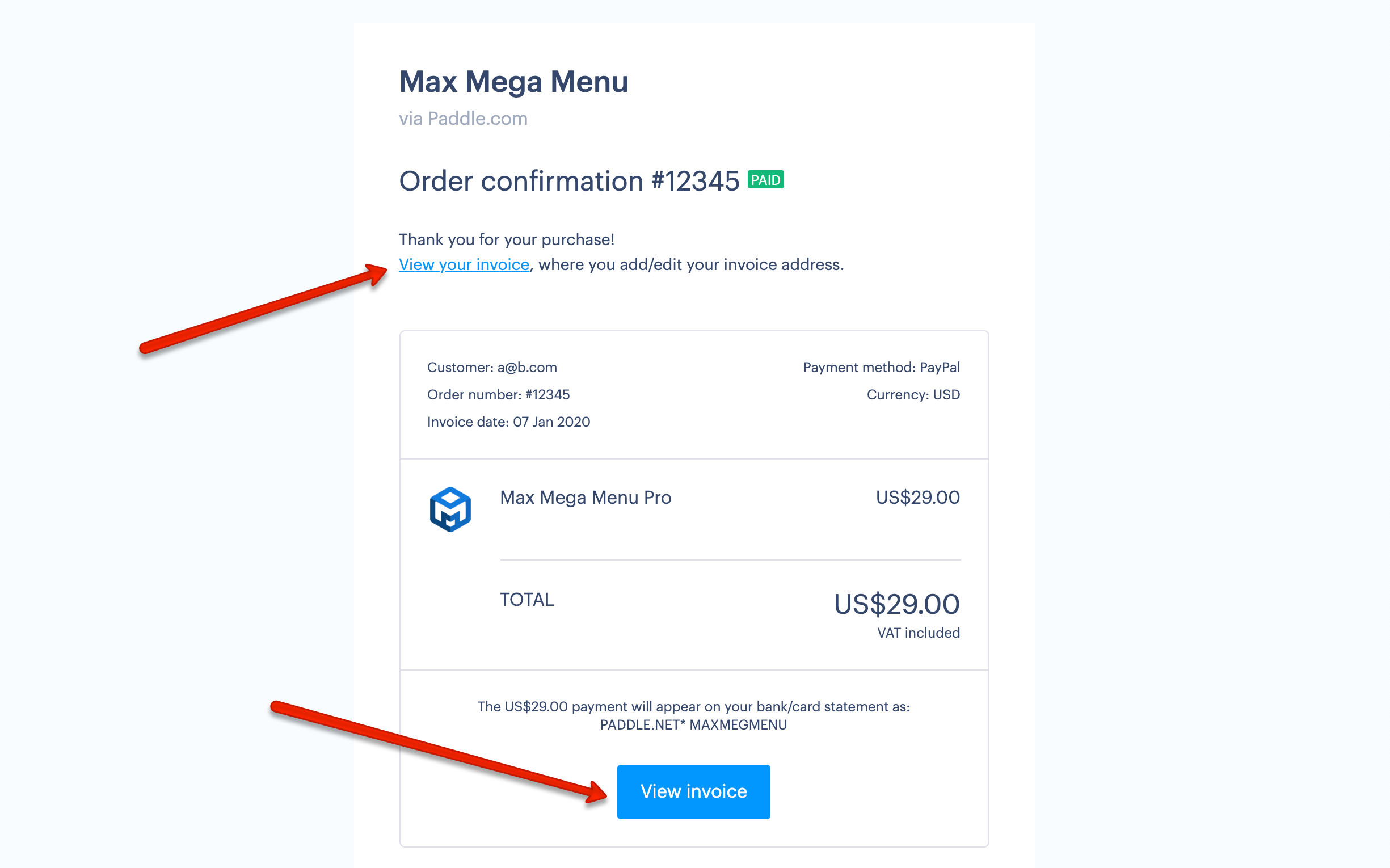 - An email from paddle.com (search your inbox for the subject line: “Your Order: Max Mega Menu Pro”). Paddle.com take the payment and therefore send the invoice.