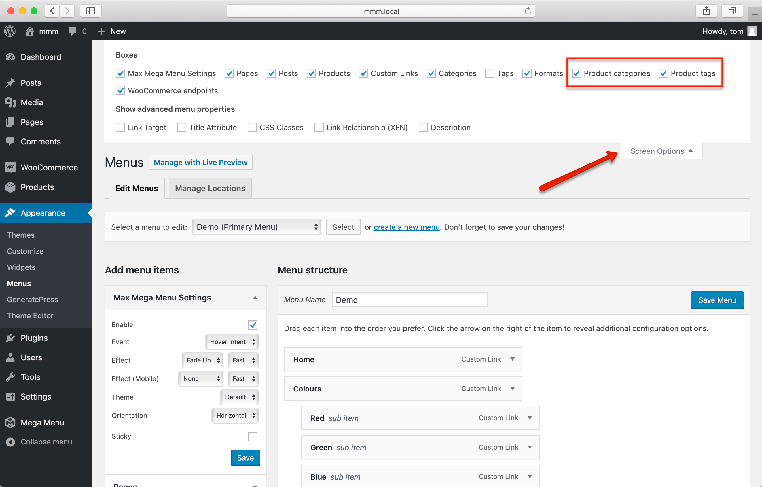 Go to Appearance > Menus and expand the “Screen Options” section at the top right of the page. Enable “Product categories” and “Product tags”.