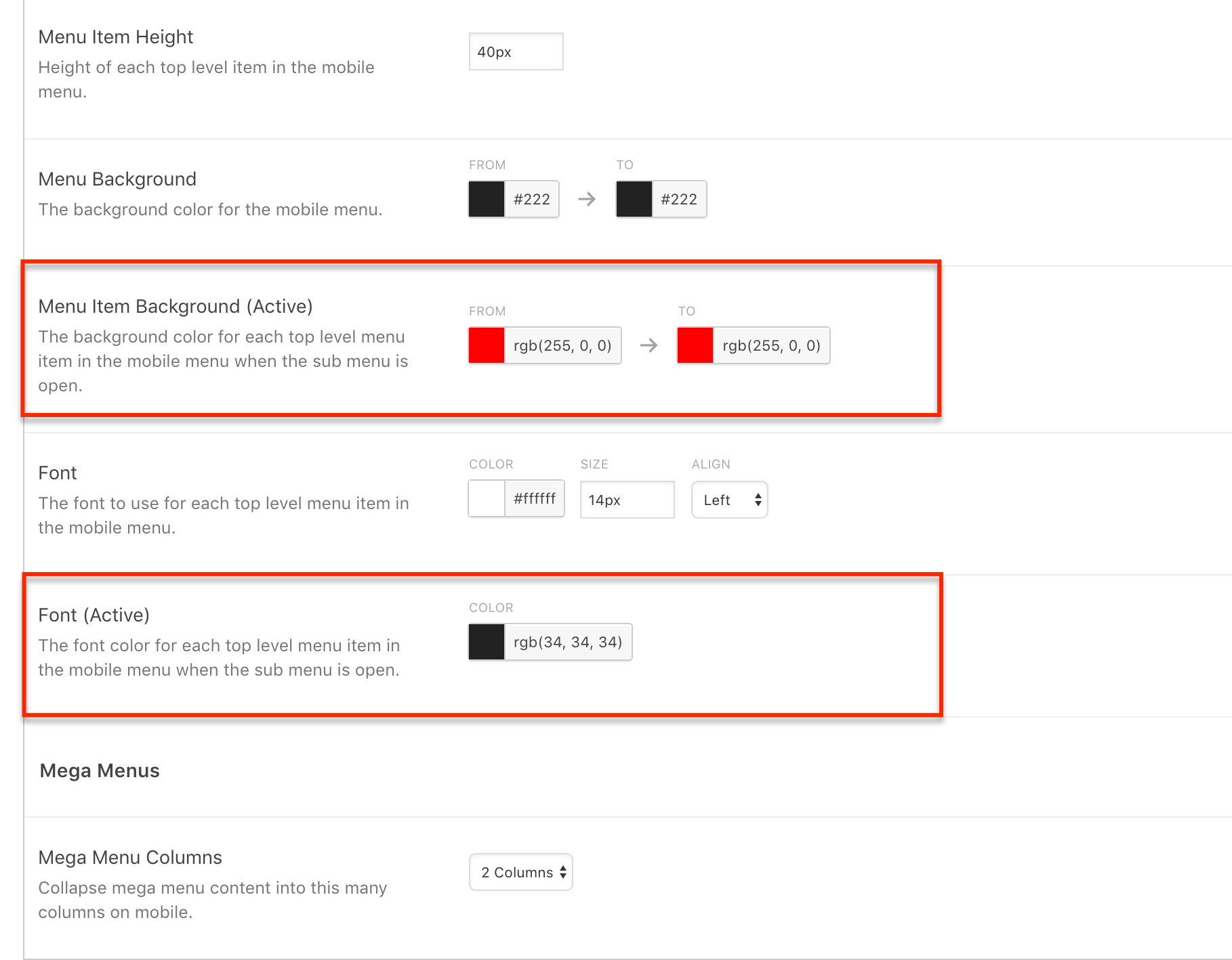 Previous to v2.5.3, hover styles would be applied to the mobile menu using the following theme editor options. These options can be found under Mega Menu > Menu Themes > Mobile Menu: