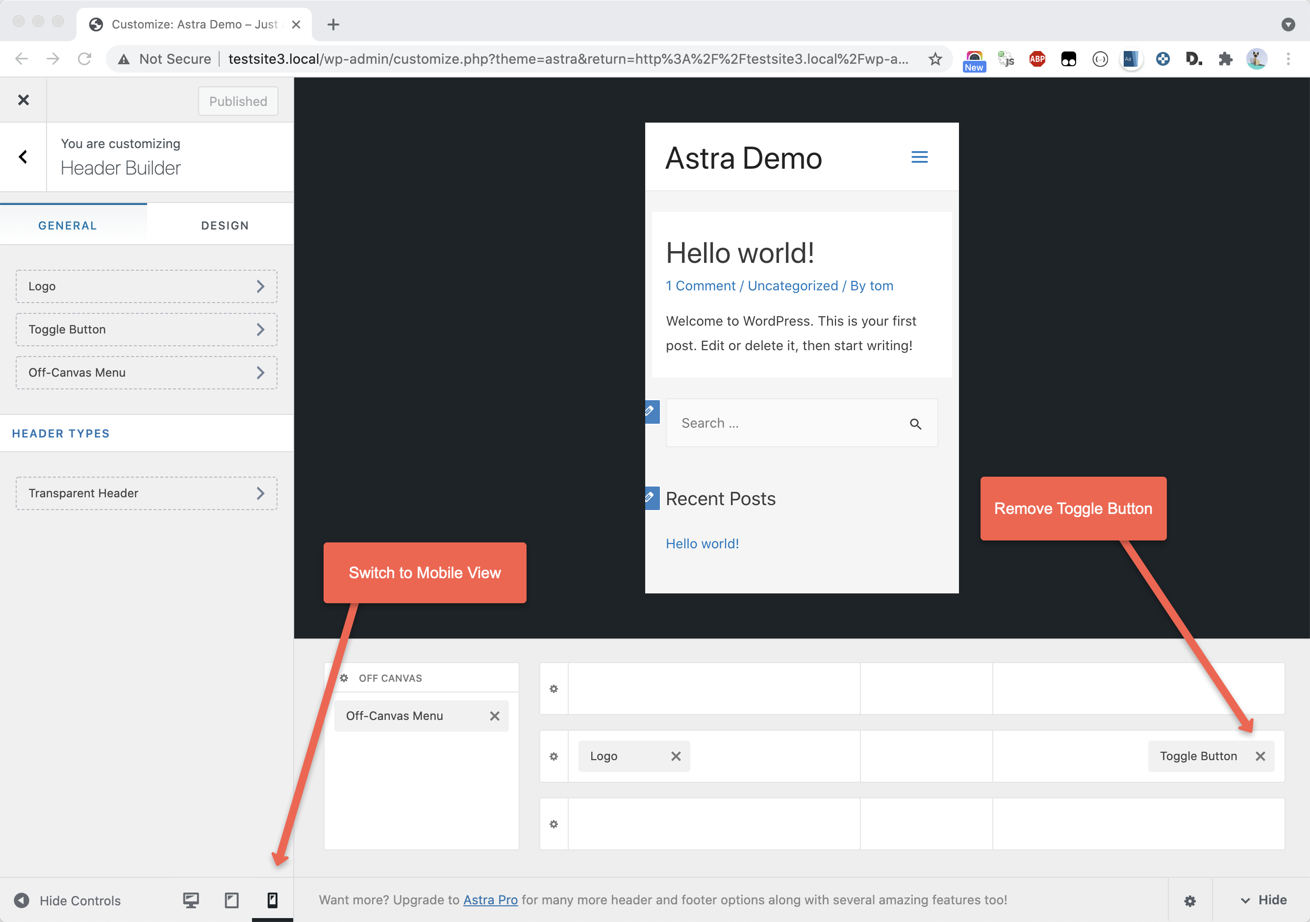 First, open the Customiser and navigate to the Header Builder. Switch to the mobile view and remove the Toggle Button block:
