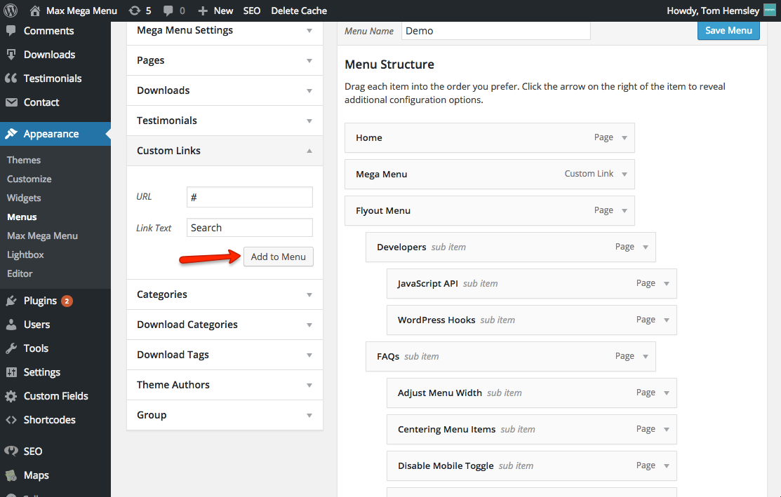Position the menu item where you’d like the search box to appear and click “Save Menu”. Once the menu structure is saved, hover over the Search item and open the Mega Menu settings for the item: