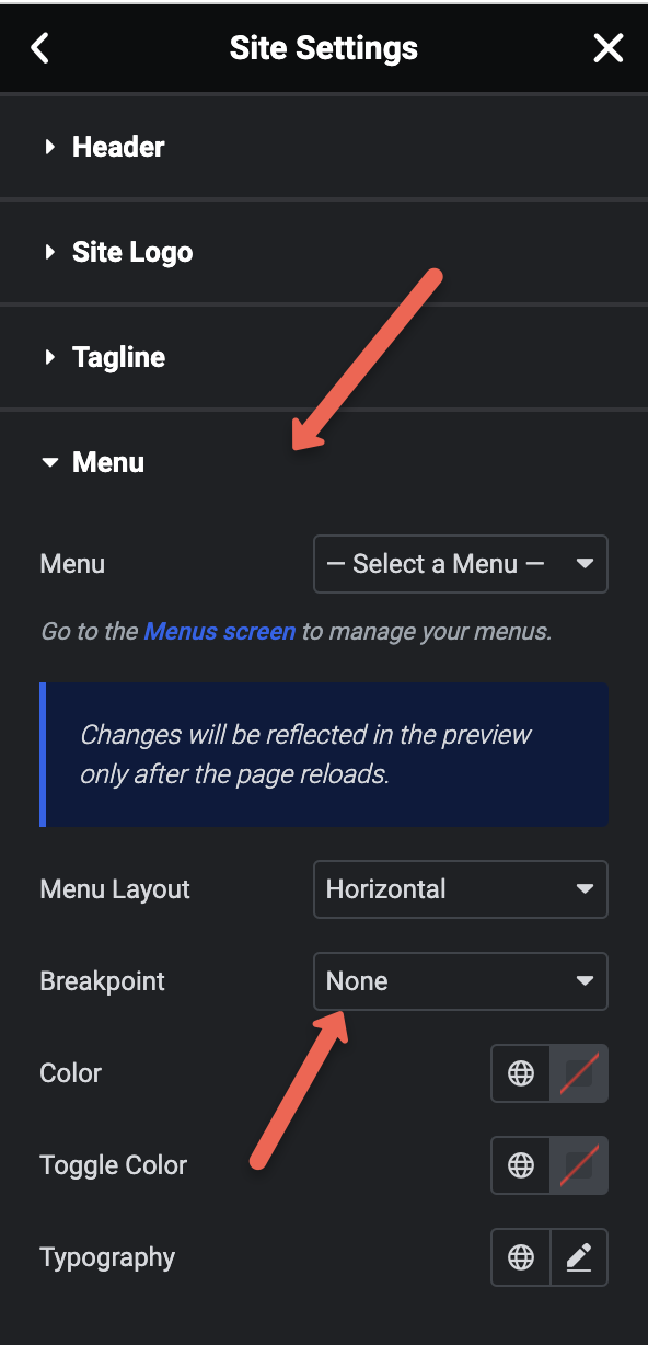 Within the Header section of the Elementor site settings, change the Menu > Breakpoint option to “None” and save: