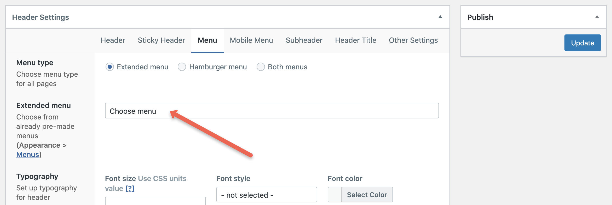 Make sure the Extended Menu in the theme settings is set to ‘Choose menu’: