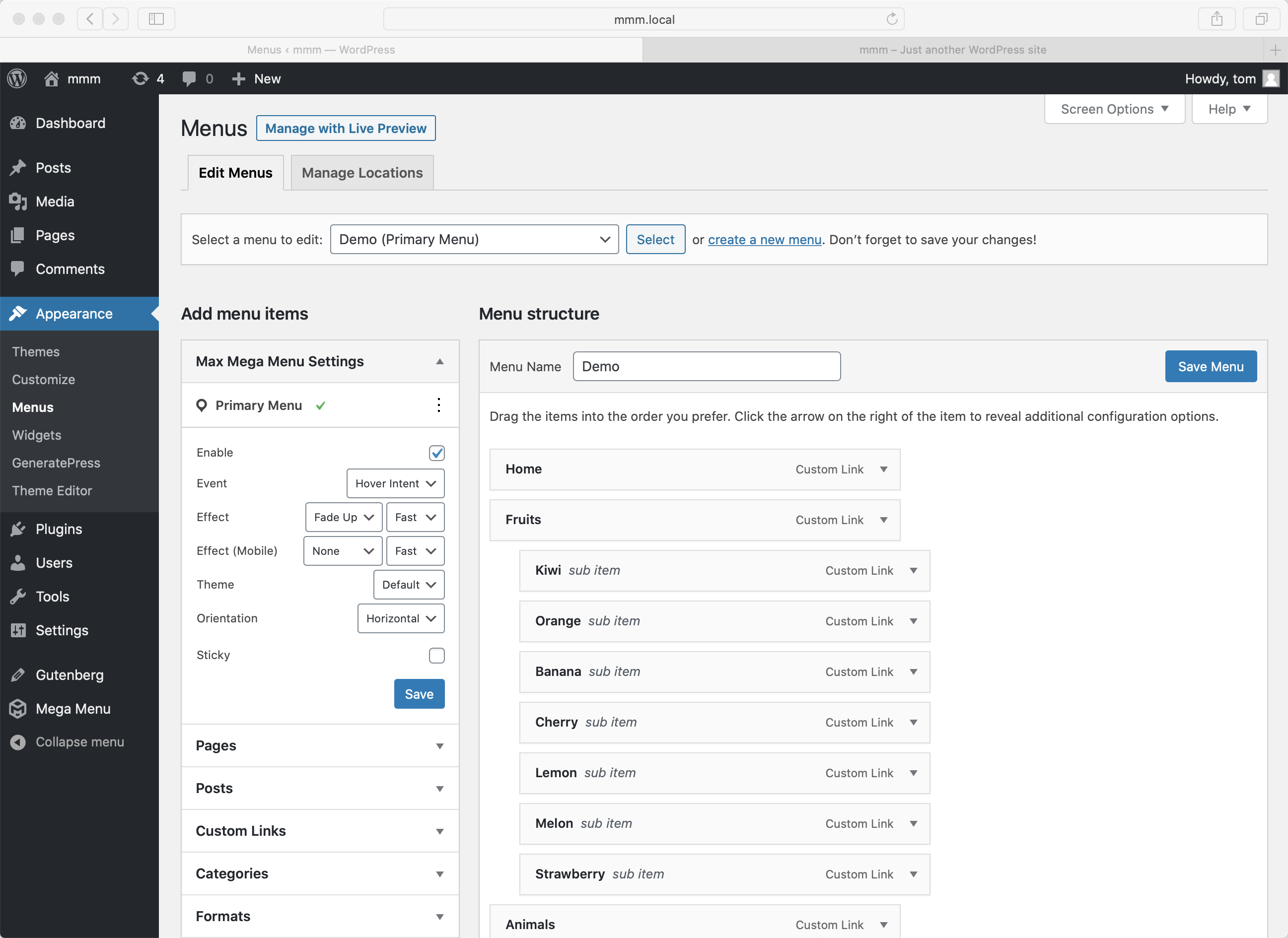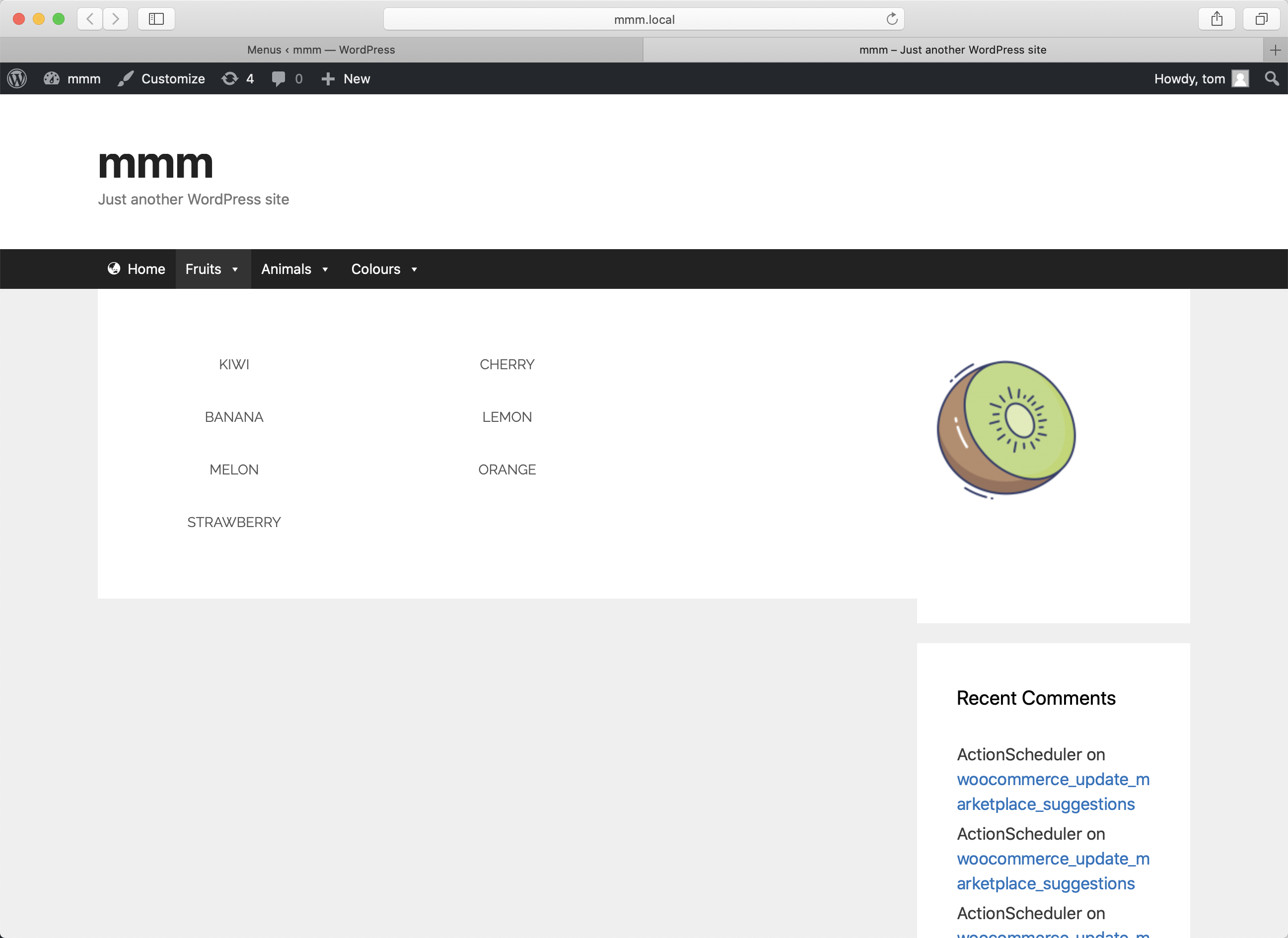 In the screenshot below we’ve set up a standard menu with a single top level item (Fruits) and 7 sub items (Kiwi, Orange etc).