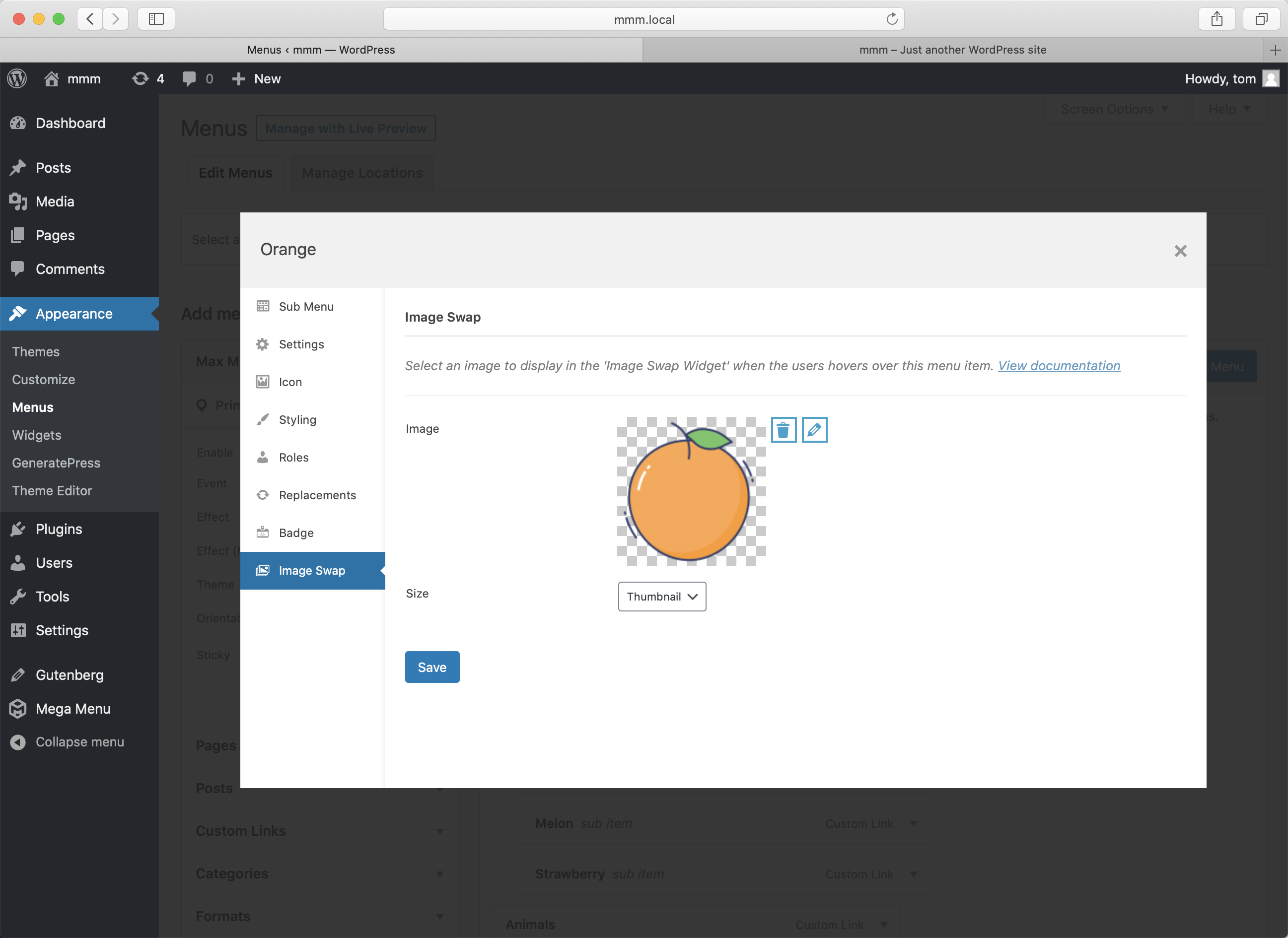 Next we need to assign an image to each of the sub menu items (Kiwi, Orange etc). To do this, hover over each of the sub menu items (Kiwi, Orange etc) and click the blue mega menu button to open the mega menu settings. Click the “Image Swap” tab. Here you can set the image that will appear when the item is hovered over by the user: