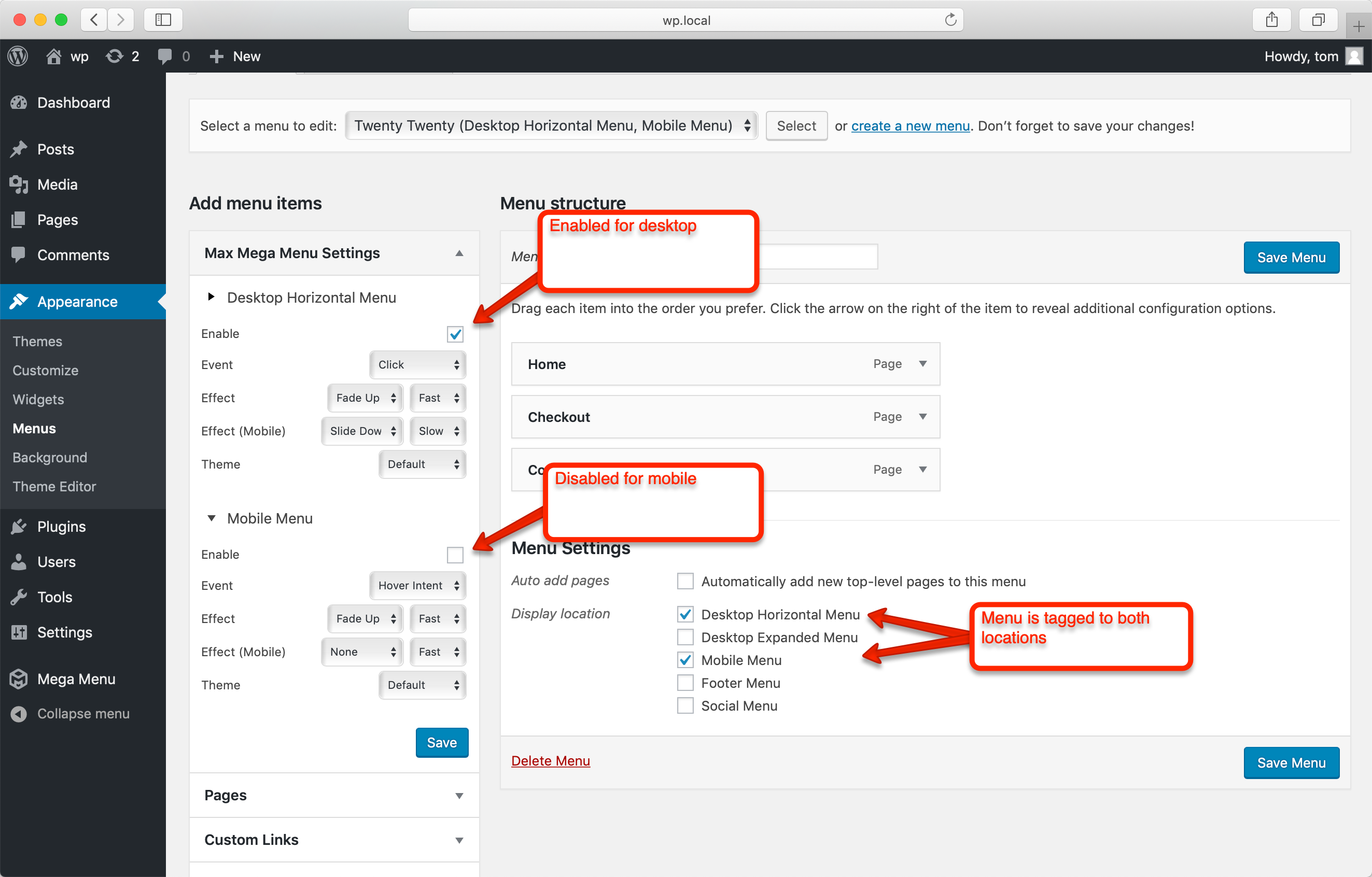 To keep the default theme mobile menu, tag your menu to the Desktop Horizontal Menu and Mobile Menu locations, but only enable Max Mega Menu for the Desktop Horizontal Menu location.