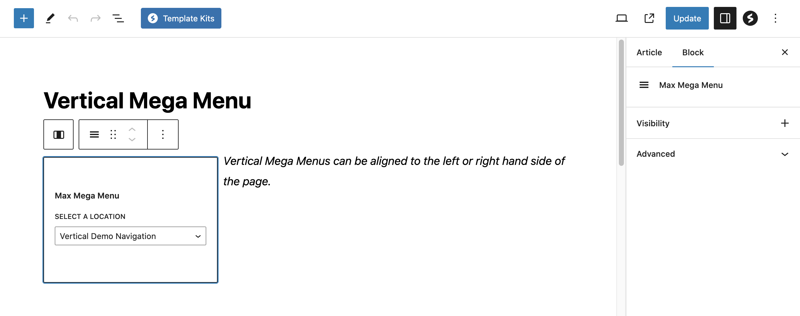 Max Mega Menu comes with a built in block. This allows easy insertion of menus into your block editor/Gutenberg/full site editing layouts. An example of this can be seen on our Vertical Menu demo page.