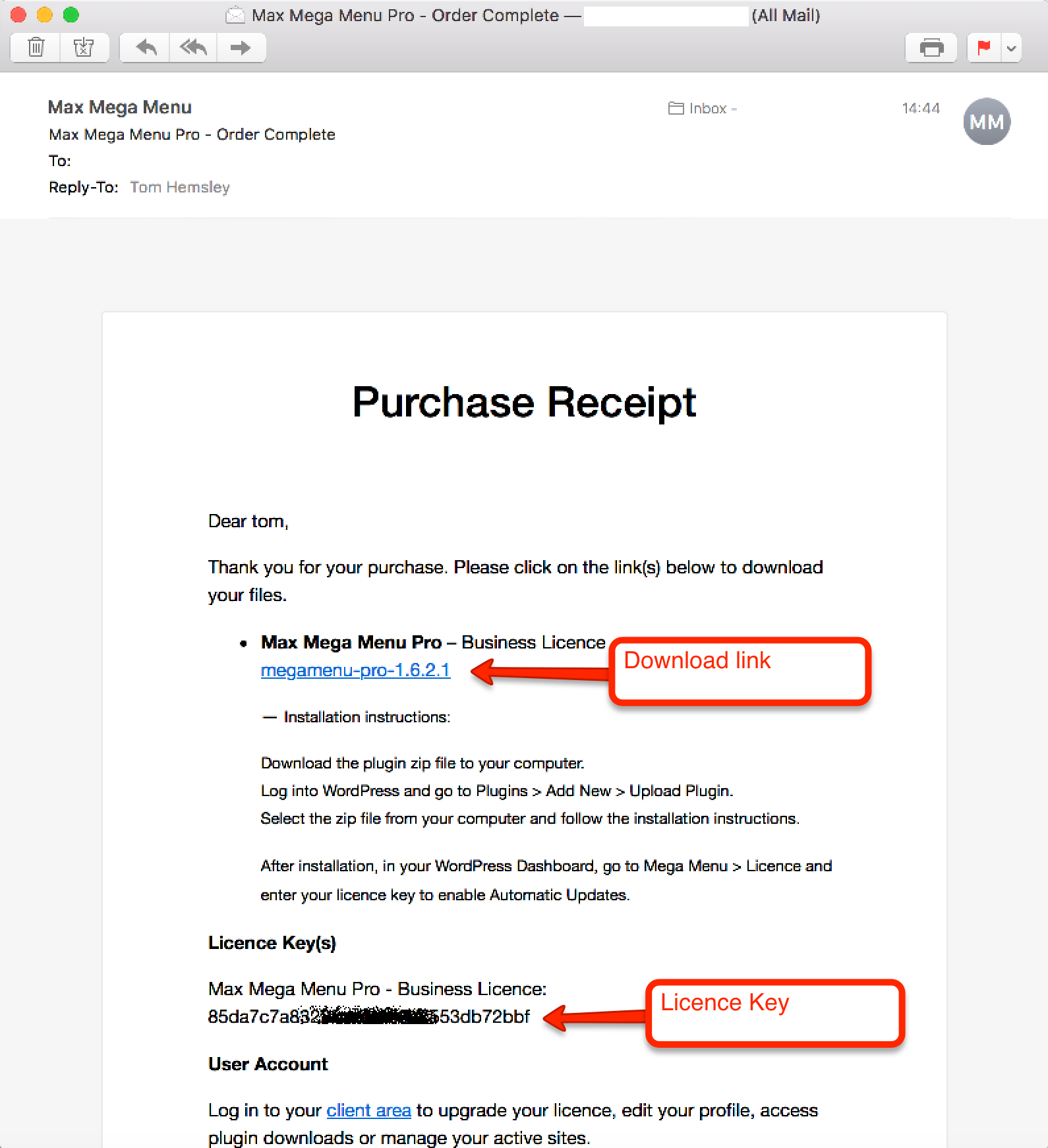 Click the link inside the email in order to download the plugin zip file to your computer.