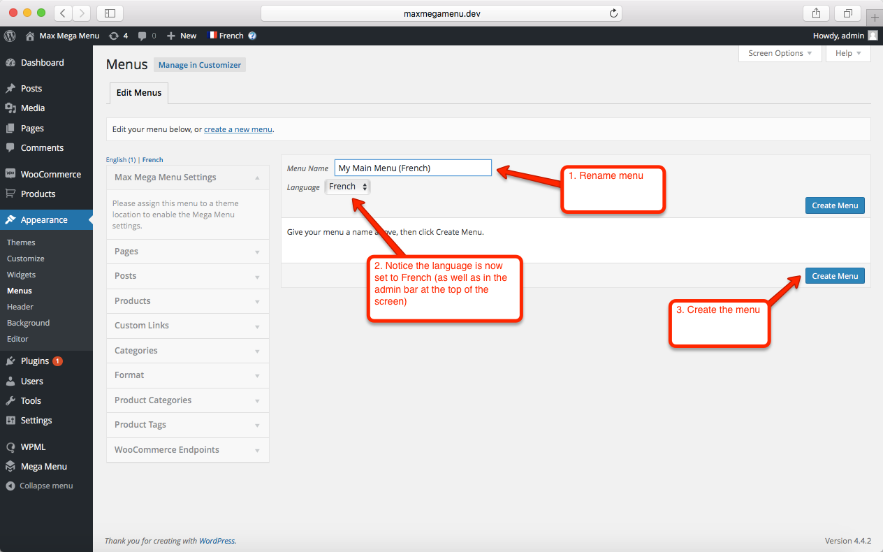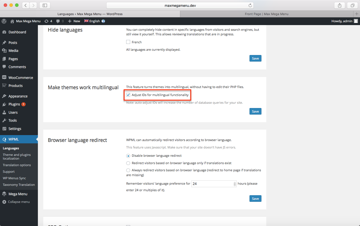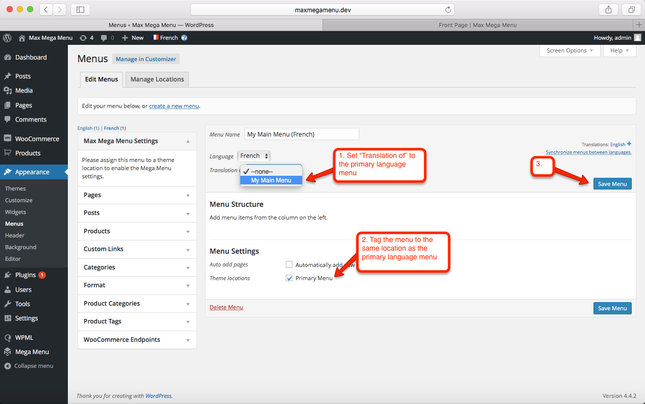 In this step we assume you’ve already set up a menu for your primary language (English) and enabled Max Mega Menu for it.